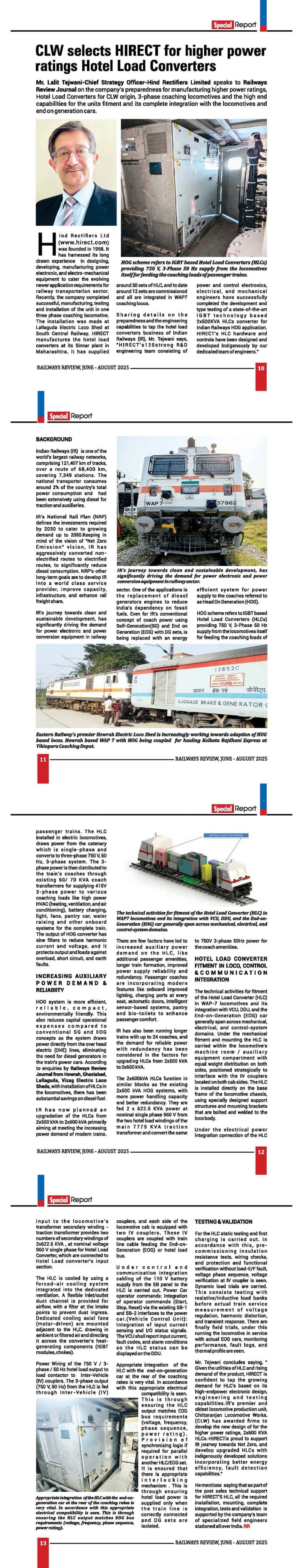 Mr. Lalit Tejwani, Chief Marketing Officer, Hind Rectifiers Limited, spoke to Railways Review Journal on the company’s preparedness for manufacturing of high power ratings, Hotel Load Converters for CLW origin, 3-phase coaching locomotives and high end capabilities for the units fitment and its complete integration with the locomotives and end on generation cars.